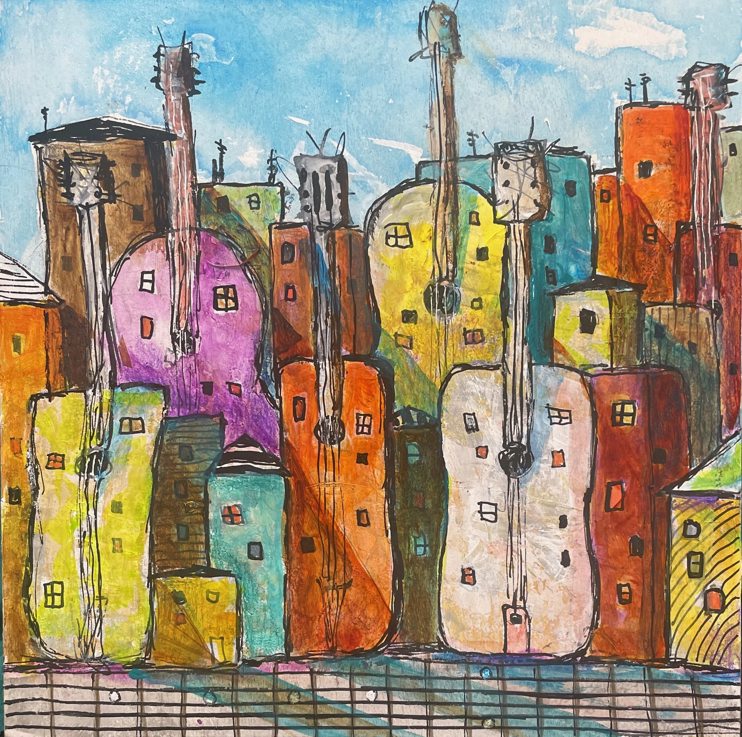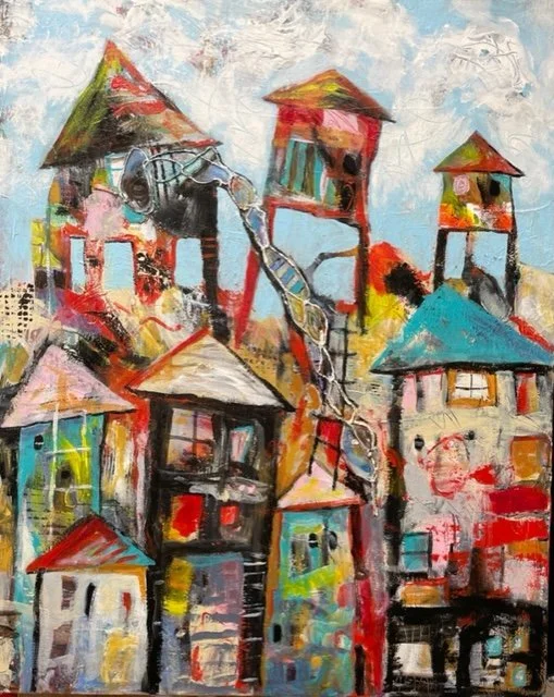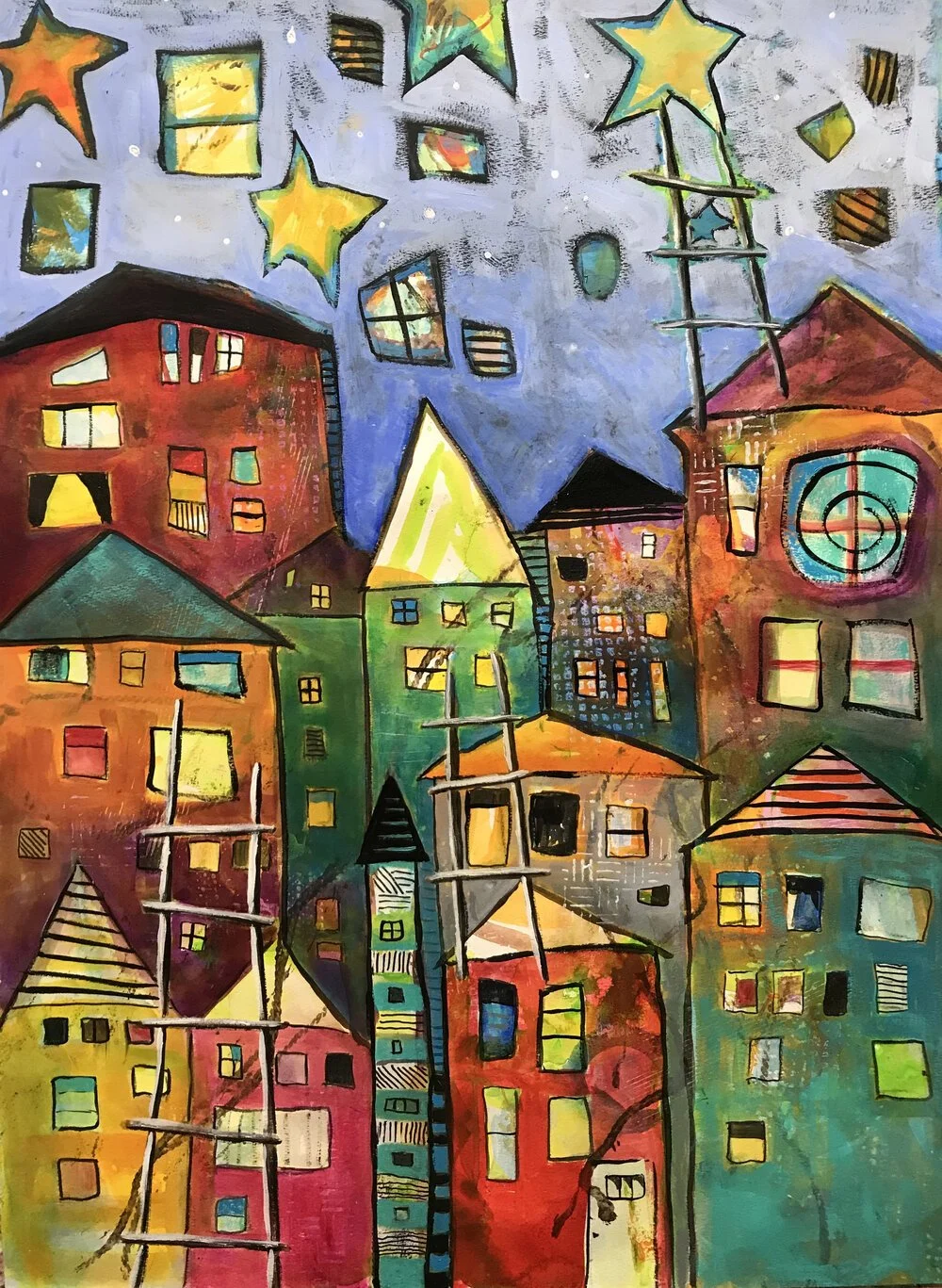 Cityscape with Paper Airplanes 24” x 36” Acrylic on cradled panel. SOLD