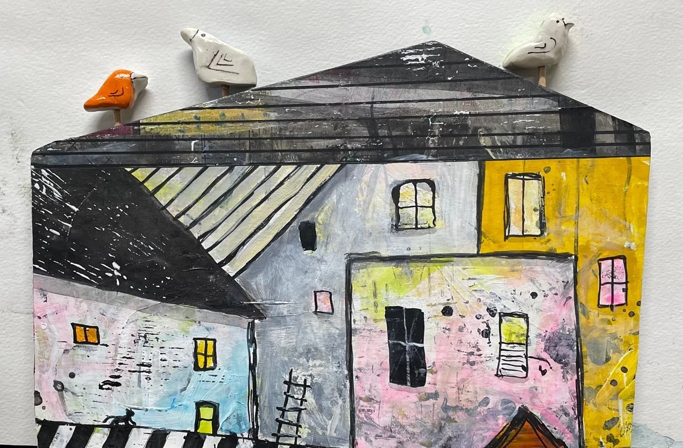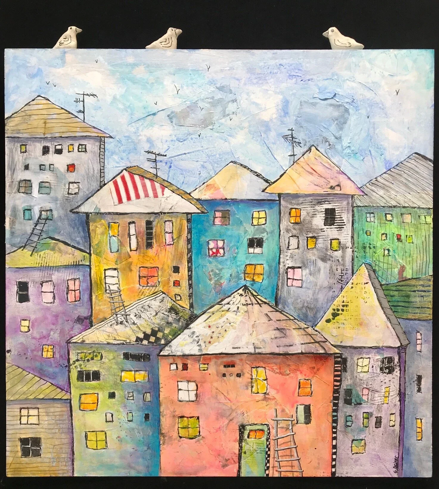"Cityscape with Paper Airplane" 20 x 16 Acrylic and collage on cradled panel. Available