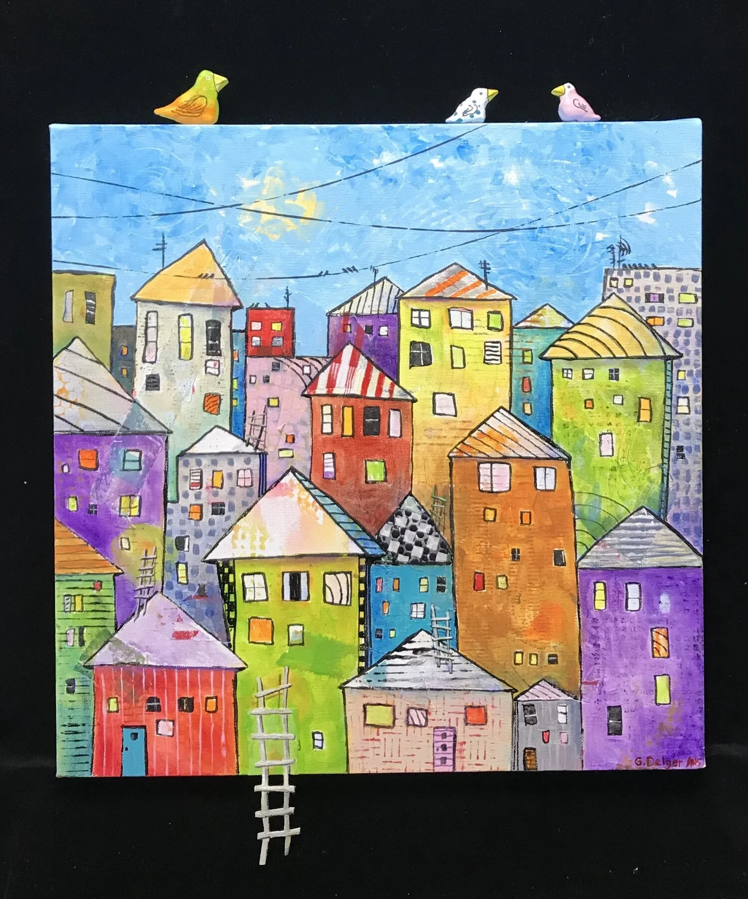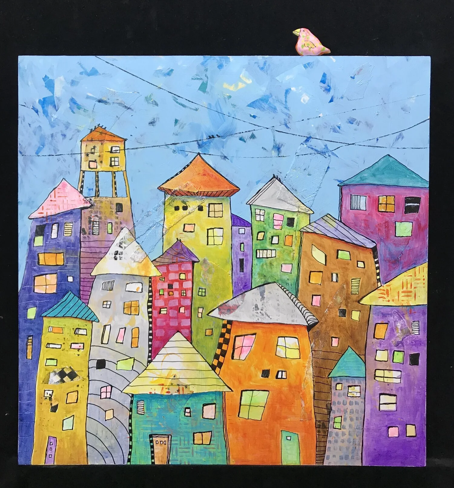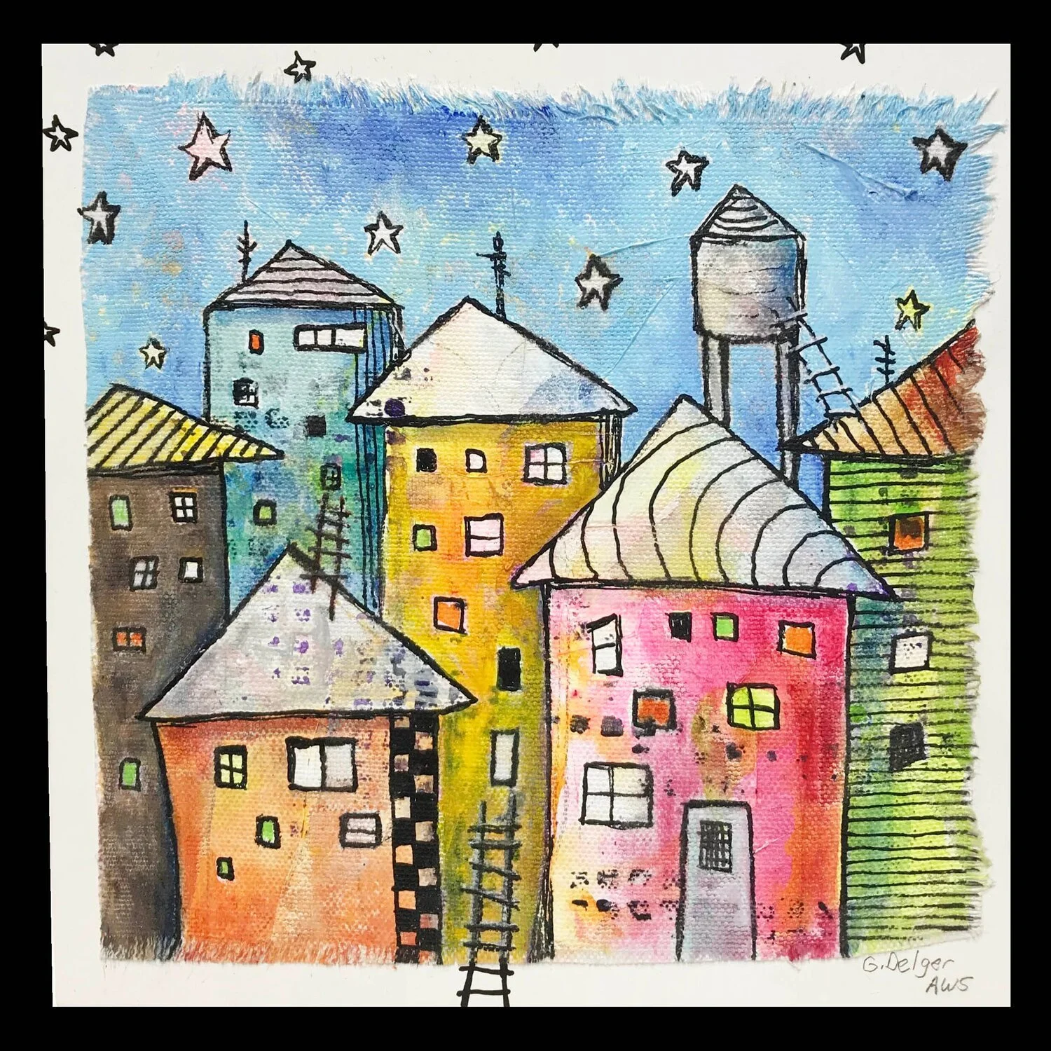 "Cityscape with Water Tower $95.00 8” x 8” Acrylic SOLD