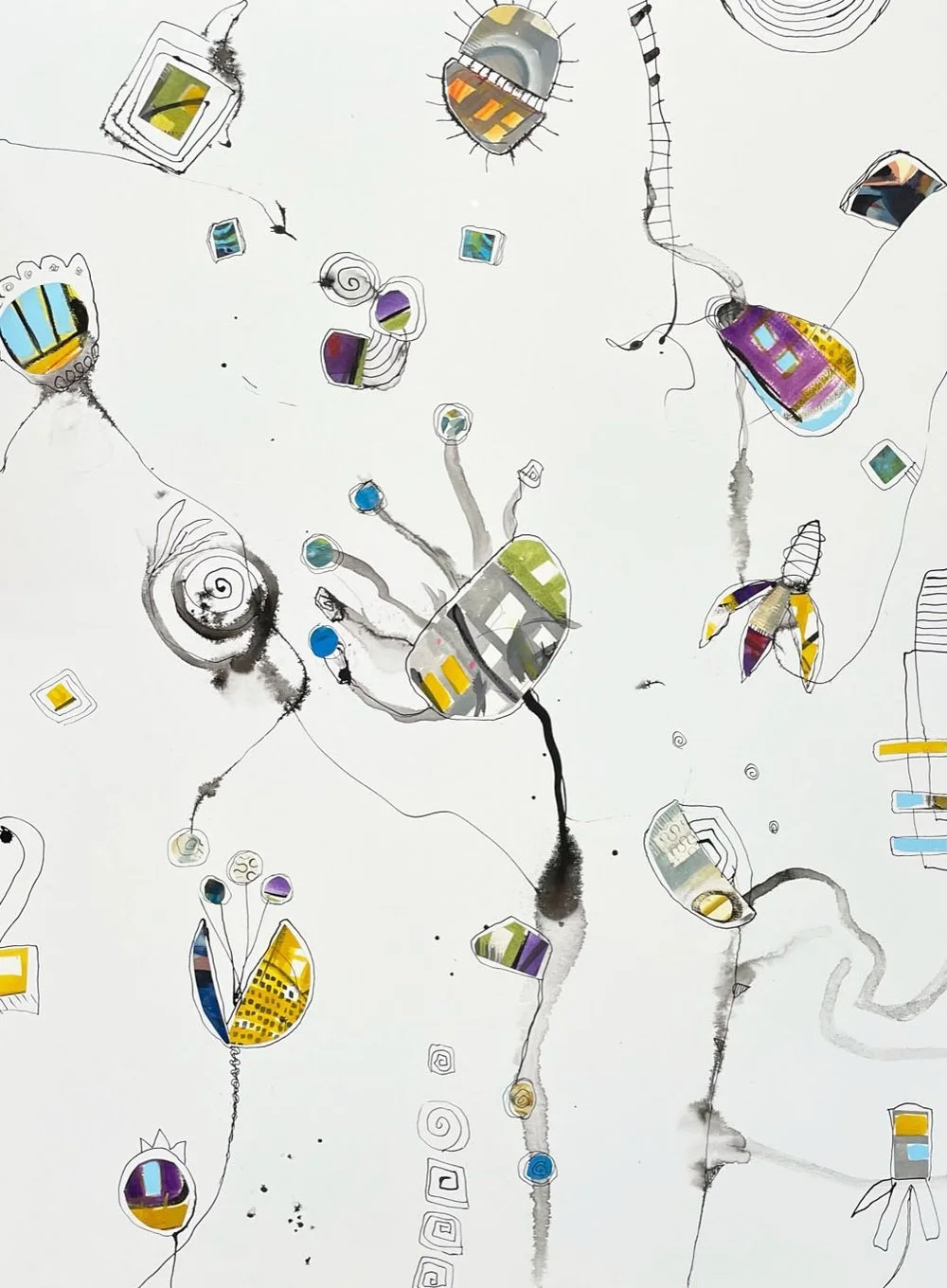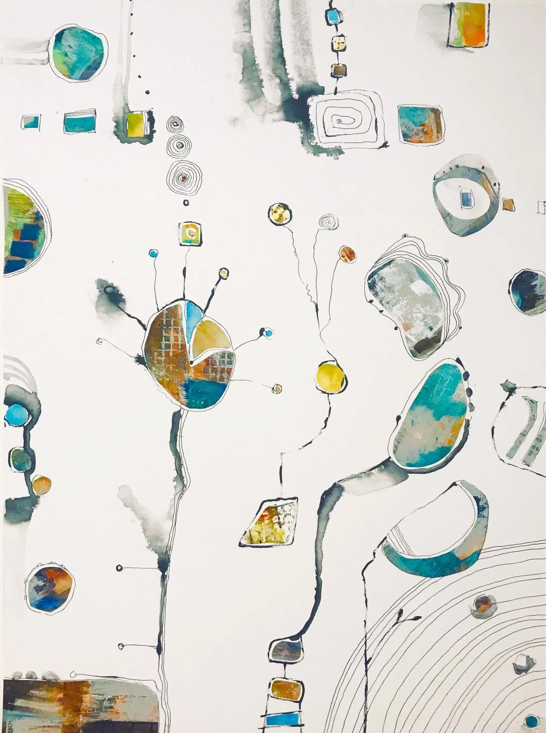 "Space Garden III" 10” x 10” Acrylic and collage on cradled panel.